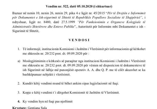 Me vendimin nr.445, datë 15.9.2020, refuzon informacionin për Komisionin e Jashtëm të Vlerësimin, me arsyetimin se Albert Dervishi ka vërtetim të marrë nga komisioni i drejtuar nga Nafiz Bezhani (se çfarë u duhet këtyre kjo punë, ec e merre vesh).