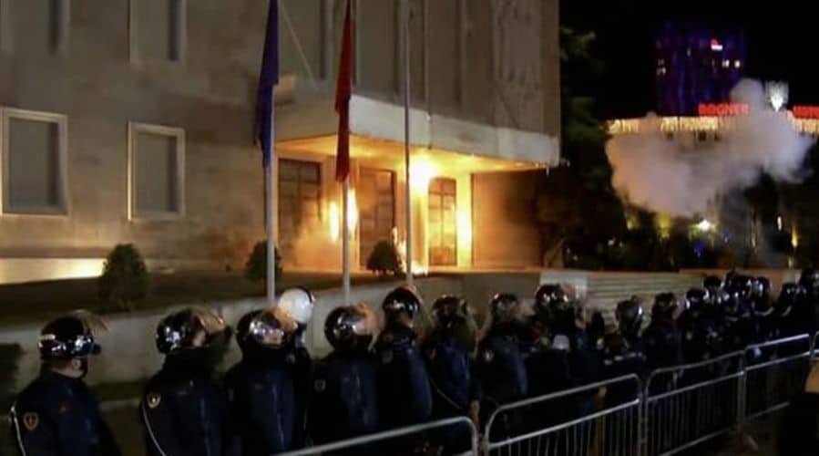 TYM E FLAKË TE KRYEMINISTRIA në Tiranë – Protestuesit sulmojnë me molotov dhe përplasen me policinë