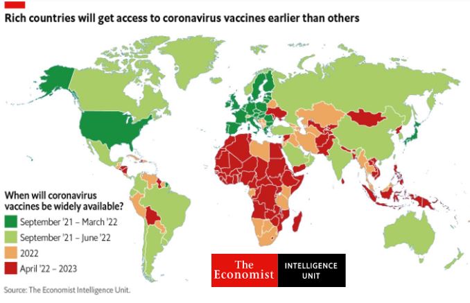 TIRANË– Vendet e pasura dhe të fuqishme do mund të kenë akses për sigurimin e vaksinës para shteteve të tjera! Kështu shkruan ‘The economist’ në një shkrim të publikuar ku ka ndarë dhe hartën e shteteve duke i vendosur ngjyra për të treguar se kur do e sigurojnë vaksinën.