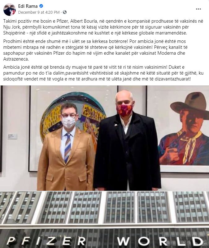 Kjo bie ndesh me deklaratën e kryeministrit Edi Rama në 9 dhjetor postoi një foto në një ekspozitë me bosin e kompanisë farmaceutike Pfizer, Albert Bourla prej nga u shpreh se vaksina do të vijë brenda dy muajve të parë të vitit.