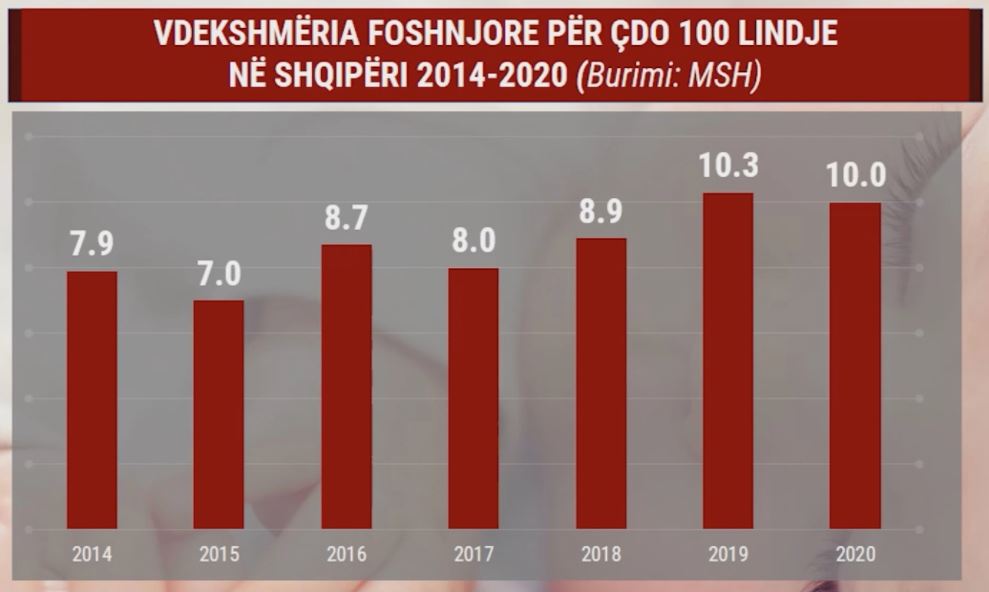 Thënë ndryshe, në vend përfundojnë në fatalitet 10 foshnjë për çdo 1 mijë lindje, raport ky që luhatet e rritet nga viti në vit. (grafik vdekshmëria foshnjore për çdo 1 mijë lindje në Shqipëri 2014-2020).