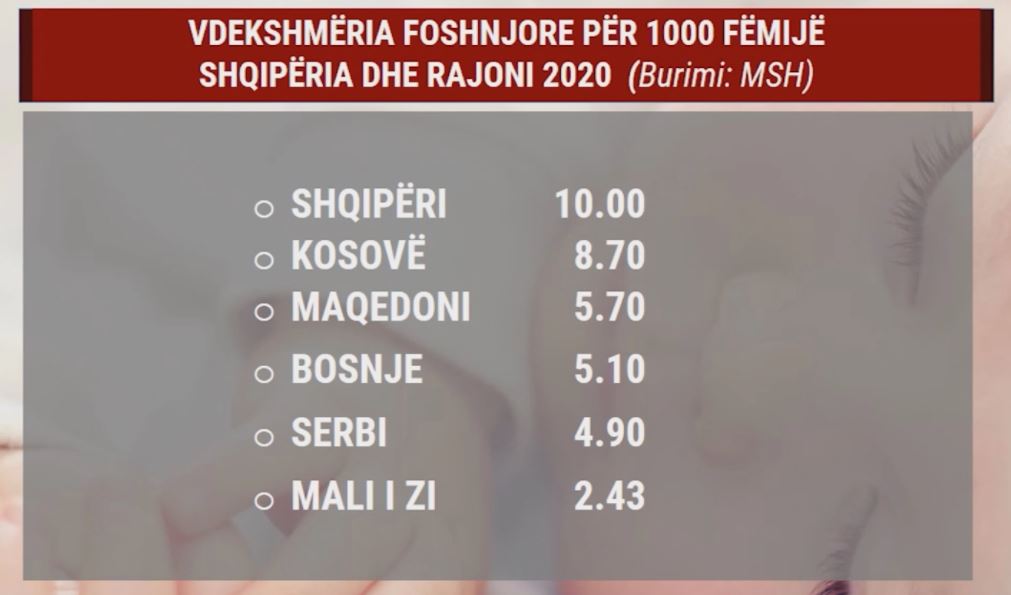 Në Shqipëri, humbin jetën më shumë bebe se në çdo shtet të Rajonit. Në vend, raporti i fataliteteve për çdo 1 mijë lindje është 10, duke u ndjekur nga Kosova, Maqedonia e Veriut, Bosnjë-Hercegovina, Serbia e Mali Zi.