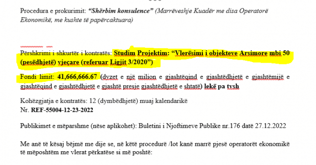 Mësohet se tenderi është me procedurën “shërbim konsulence”, marrëveshje kuadër me disa operatorë ekonomikë, me kushte të papërcaktuara. “Përshkrimi i shkurtër i kontratës është studim-projektim ‘vlerësimi i objekteve arsimore mbi 50 vjeçare’” thuhet në dokumente, teksa fondi i kësaj procedure është 41.666.666 lekë pa TVSH. Kohëzgjatja e kontratës do të jetë 12 muaj kalendarikë. Në procedurë morën pjesën 22 firma me ofertat e tyre, nga të cilat 5 u s’kualifikuan. Fitues u shpall “ATELIER 4” shpk & ”SEED CONSULTING”, me një vlerë të ofruar prej 41.666.660 lekë pa TVSH, teksa morën 92 pikë në total.