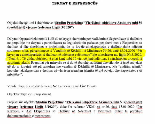 “Operatori ekonomik i cili do të kryejë shërbimin për realizimin e ekspertizave të thelluara…, do të kryejë akt-ekspertizën e thelluar duke ndjekur strukturën sipas përcaktimeve të Vendimit të Këshillit të Ministrave Nr.26, datë 15.01.2020 ‘Për kryerjen e akt-ekspertizës së thelluar në ndërtesat e dëmtuara’ kjo mbështetur në ligjin nr.3/2020, në nenin ‘neni 4/1’” thuhet në dokumente. Në këtë nen shkruhet se “të gjitha objektet, të cilat kanë mbi 50 vjet që janë ndërtuar, i nënshtrohen procesit të auditimit teknik. Rregullat për mënyrën se si do të zbatohet auditimi dhe cilat do të jenë subjektet që do ta kryejnë atë përcaktohen me vendim të Këshillit të Ministrave. Me ‘auditim teknik’ kuptohet akt-ekspertiza e thelluar që vlerëson gjendjen teknike të një objekti dhe kapacitetet e tij mbajtëse”, thuhet në këtë dokument.