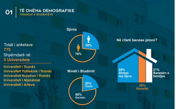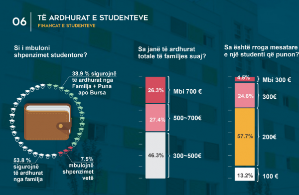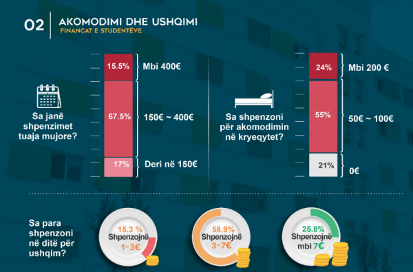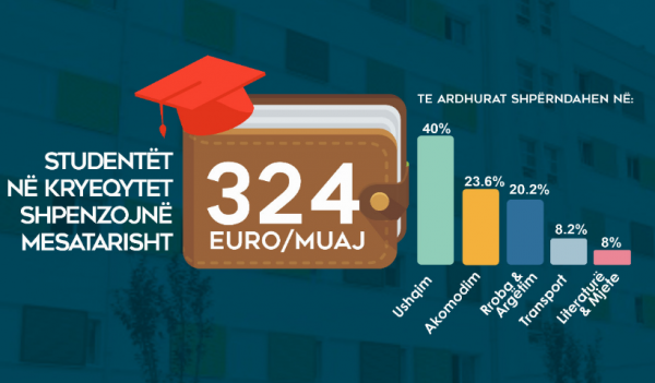 Nga përllogaritja e të dhënave të sondazhit rezulton se një student në Tiranë shpenzon mesatarisht 324 euro në muaj, ku peshën më të amdhe e zënë qeraja dhe ushqimi. Ndërkohë 53.8% e studentëve të ardhruat mujore ja mbulon 100% familja e tyre, 38.7% të ardhurat i sigurojnë pjesërisht nga familja dhe nga bursa ose punësimi i tyre, ndërsa vetëm 7.5% e studentëve arrijnë ti mbulojnë të ardhurat mujore vetëm nga puna e tyre.