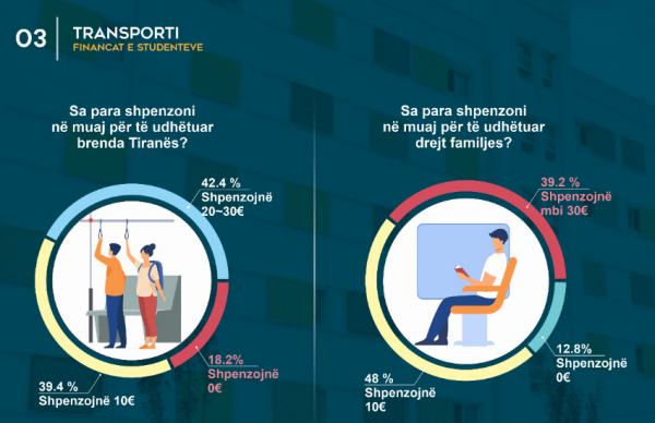 Transporti është një nga nevojat kryesore të studentëve në Tiranë. Rreth 70% e studentëve shpenzojnë 10 deri në 20 euro në muaj për të udhëtuar jashtë Tiranë dhe po kaq edhe për transportin brenda për transportin urban.