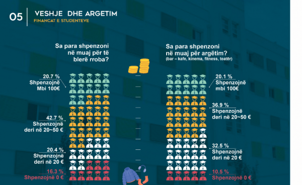Një zë të rëndësishëm në portofolin studentor zënë veshjet dhe argëtimi ku, 63.4% e tyre shpenzojnë 10 deri në 50 euro në muaj për veshmbathje dhe 69.4% thonë se shpenzojnë 10 deri në 50 euro në muaj për argëtim. Ndërkohë që 16.3% e studentëve shprehen se shpenzojnë 0 lek për veshmbathje dhe 10.5% e tyre deklarojnë se shpenzojnë 0 lek për argëtim.