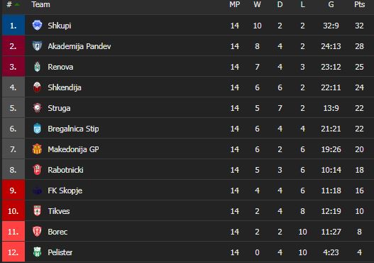 Pas 14 javësh, Shkupi prin me 32 pikë, katër më shumë se Akademija Pandev e vendit të dytë. Në vendin e tretë dhe të katërt Renova dhe Shkëndija, ndërsa Struga në të pestin.