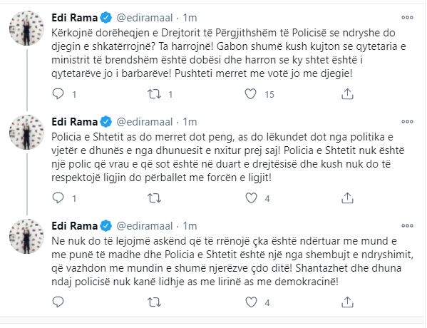 Edi Rama në Twitter: Kërkojnë dorëheqjen e Drejtorit të Përgjithshëm të Policisë se ndryshe do djegin e shkatërrojnë? Ta harrojnë! Gabon shumë kush kujton se qytetaria e ministrit të brendshëm është dobësi dhe harron se ky shtet është i qytetarëve jo i barbarëve! Pushteti merret me votë jo me djegie!