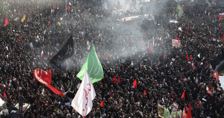 Në Teheran, qytetarët marrin pjesë në ceremoninë mortore të gjeneralit iranian, Qasen Soleimani dhe të bashkëluftëtarëve të tij, që u vranë në Irak në një sulm të SHBA-së me dron. 6 janar, 2020. (AP Photo/Ebrahim Noroozi)