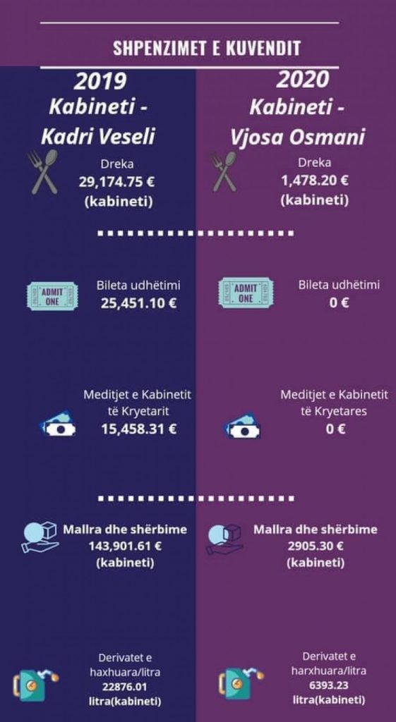 Për momentin, mund ta shihni këtë krahasim, për 11 muajt e mi si Kryetare e Kuvendit (i bazuar në raportet zyrtare të Kuvendit) dhe shumë shpejt do të publikoj edhe raportin e shpenzimeve të krahasuara në Presidencë (Vini re: Shpenzimet janë për komplet kabinetin e jo shpenzimet e mia individuale).