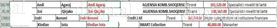 Ndërkohë, dy të arrestuarit e tjerë, Endri Ikonomi rezulton në databazën e prillit se është drejtori i përgjithshëm i një institucioni financier “Credit 2 Al” dhe ai paguhet në muaj me vlerën 387,774 lekë ose rreth 3800 USD. Kurse personi tjetër, identifikuar si Klodian Sota është menaxher pranë kompanisë “Smart Collection” dhe paguhet me pagë minimale rreth 40 mijë lekë, ose 400 USD.