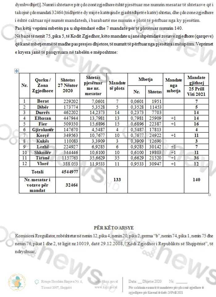 Konkretisht me 5 dhe 4 deputetë ndërsa mandatet e hequra nga këto qarqe i shtohen Tiranës që bëhet me 36 të tilla.