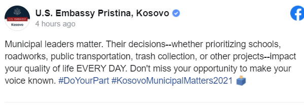 “Kryetarët e komunave kanë rëndësi. Vendimet e tyre – pavarësisht nëse i jepni përparësi shkollave, punimeve në rrugë, transportit publik, grumbullimit të plehrave ose projekte të tjera, ndikojnë në cilësinë e jetës tuaj çdo ditë. Mos e humbisni rastin tuaj për të bërë të njohur zërin tuaj”, thuhet në postim.