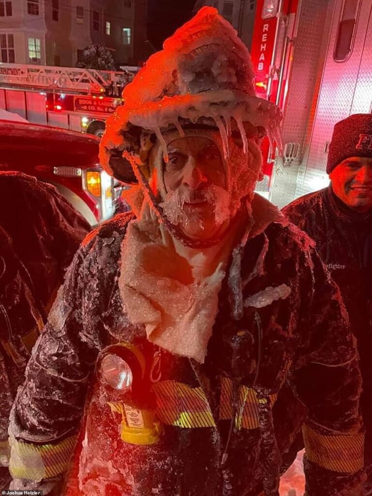 Zjarrfikësit në foton e shkrepur nga kolegu i tij Joshua Hetzler, i ka ngrirë helmeta, veshja, vetullat dhe mustaqet, pasi po punonte për të fikur zjarrin në qytezën Fall River, i rrethuar nga bora dhe akulli.