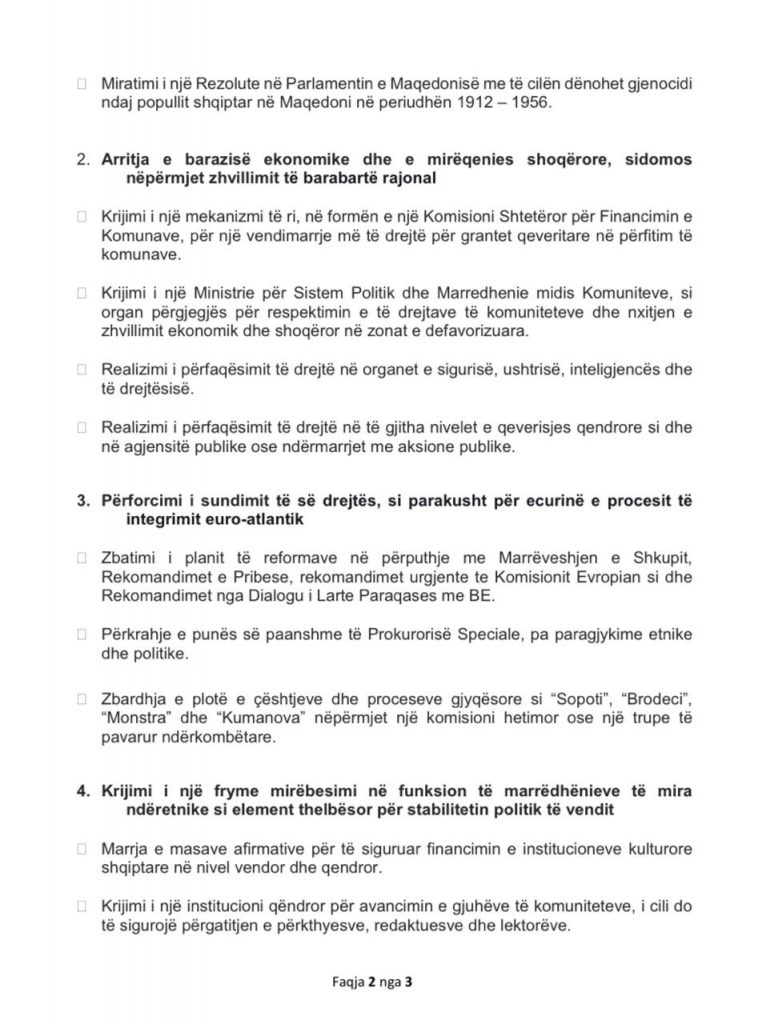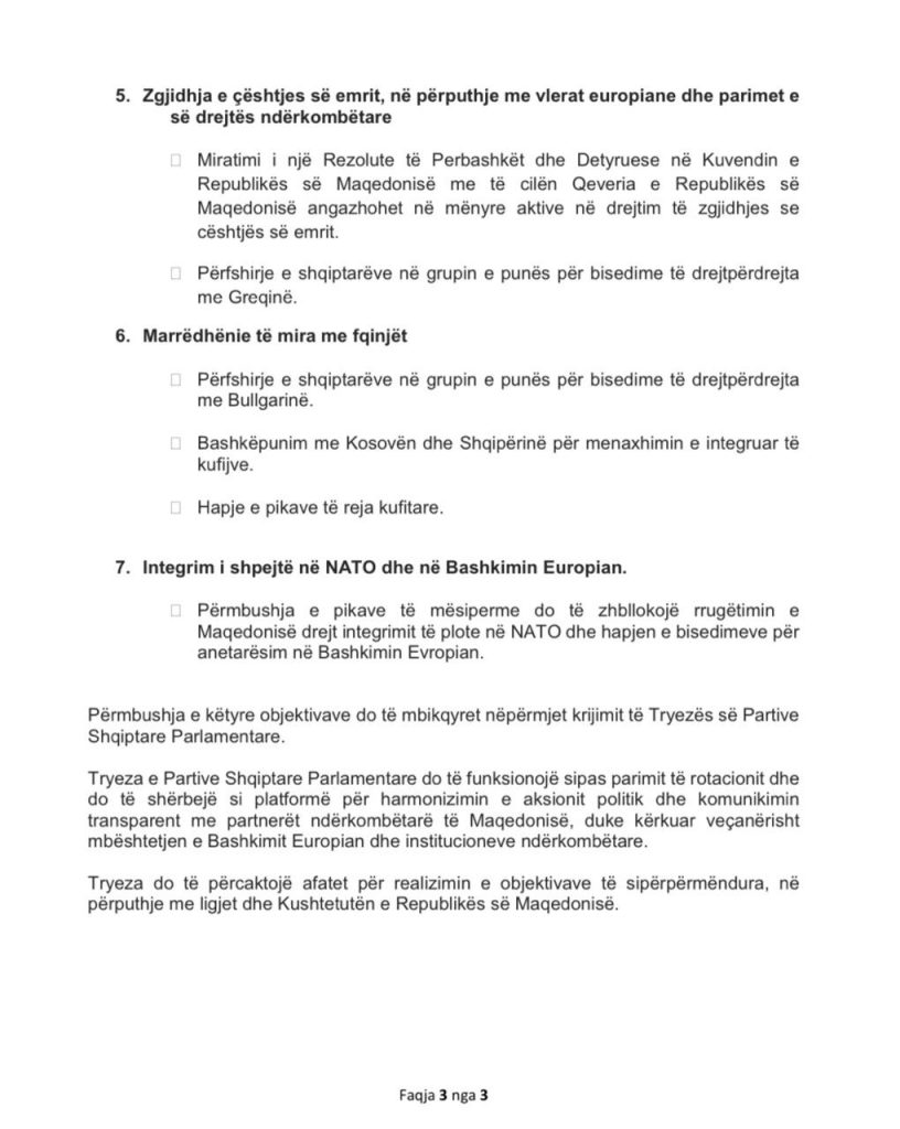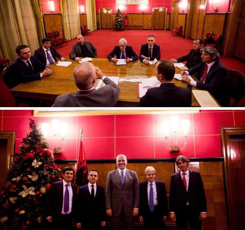 Pra pas një politike agresive të VMRO-së dhe patericizmin e BDI-së për vite të tëra në raport me shqiptarët dhe të drejtat kolektive politike të tyre, Qeveria e Republikës së Shqipërisë, përkatësisht Ministri i Punëve të Jashtme, Ditmir Bushati dhe Kryeministri i Republikës së Shqipërisë , Edi Ramën u kujdesën për një takim përbashkues sa i përket linjave të kuqe që shqiptarët duhet të jenë të bashkuar në kërkesat e tyre, që në fakt supozohej se do të merrnin trajtën e kushteve në marrëveshjet post-elektorale në çdo palë zgjedhje që do të mbaheshin.