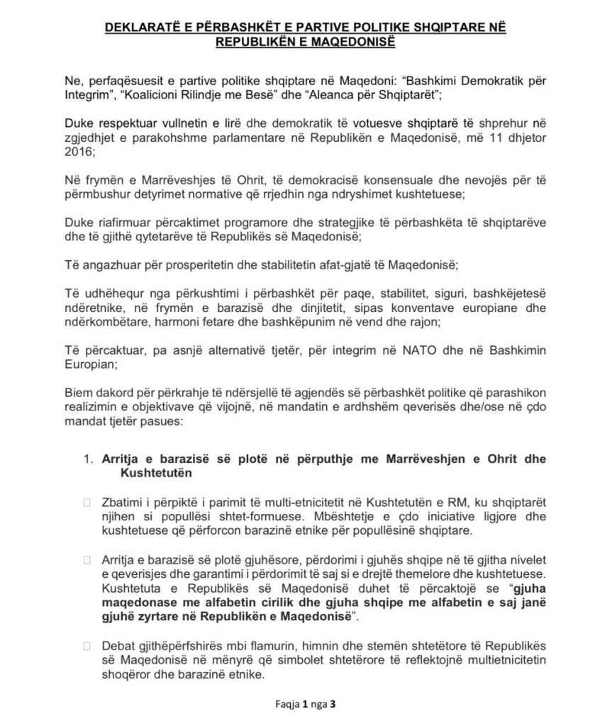 Pas zgjedhjeve të 11 dhjetorit të vitit 2016 të zgjedhjeve të parakohshme parlamentare në Republikën e Maqedonisë ( së Veriut), pas qeverisjeve brutale të një autokrati si Nikola Gruevski të VMRO për të paktën 12 vite rresht pa ndërprerje së bashku me partnerin e përhershëm shqiptar BDI-në e Ali Ahmetit, Tirana zyrtare si asnjherë më parë pati një rol aktiv në sjelljen e faktorit shqiptar në Maqedoni.